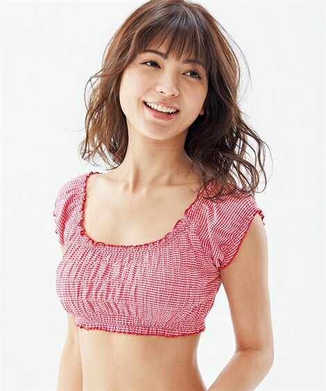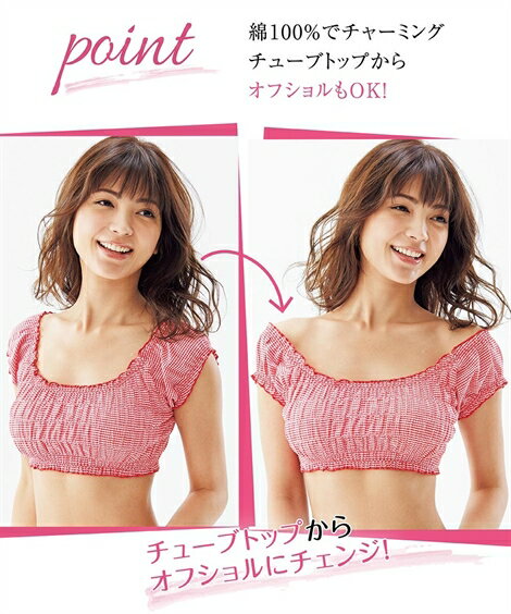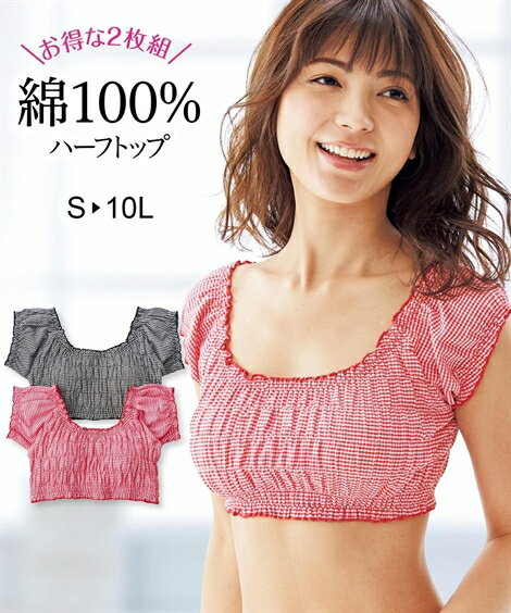 (S-L) チェック柄 オフショルダーにもなる パフスリーブ ソフトカップ付 ハーフトップ 2枚組 ニッセン nissen かわいい コットン 黒+赤 カラー 黒+赤 サイズ S/M/L 素材 品質=身生地:綿100% ソフトカップ付 (取り外し可) 柄が多少異なる場合があります。