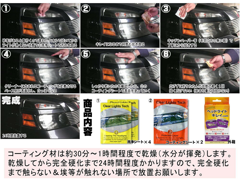 商品内容 ・洗浄シート ×4パック ・コーティングシート2パック 車のヘッドライト2台分です。